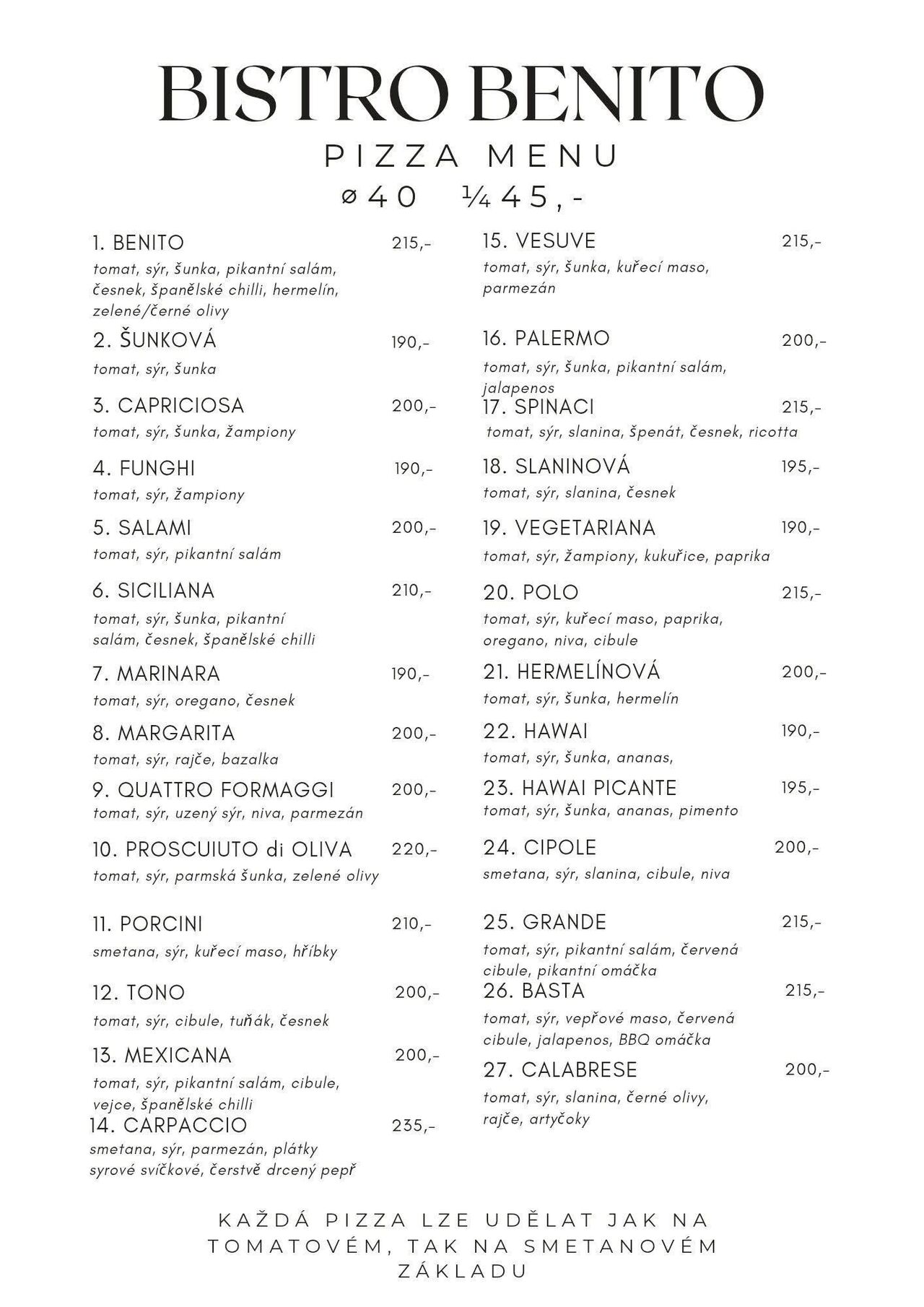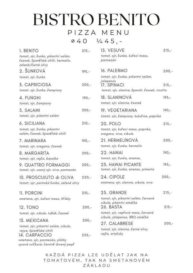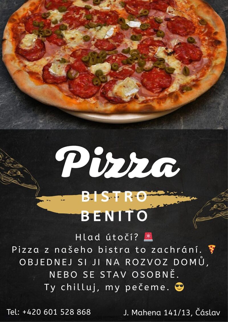 Vítejte v Bistro Benito , které se nachází v krásném městě Čáslav. Těšíme se na Vaši návštěvu! Zveme Vás k ochutnání naší autentické české a evropské kuchyně. Naši zkušení kuchaři připravují oceňovaná domácí jídla. Posaďte se a vychutnejte si náš mistrně připravený burger, pizzu a lahůdky, které uspokojí všechny chutě. Pochutnáte si zde i na našich lahodných sladkých dezertech. Zaměřujeme se na rozmanité dietní preference a nabízíme řadu vegetariánských možností. Máte hlad? Navštivte nás a vychutnejte si chutnou snídani a oběd v příjemném prostředí.